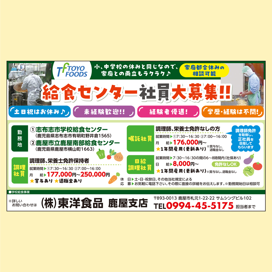 時間: 【調理スタッフ】シフト制 ※1日あたり8時間のシフト制にて勤務 (休憩時間 60分) 他