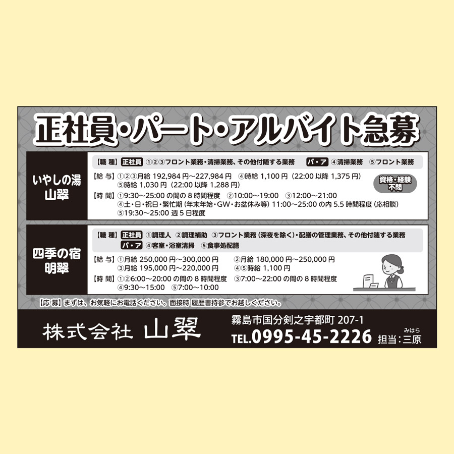 職種: 【いやしの湯 山翠】《正社員》①②③フロント業務・清掃業務、その他付随する業務 他