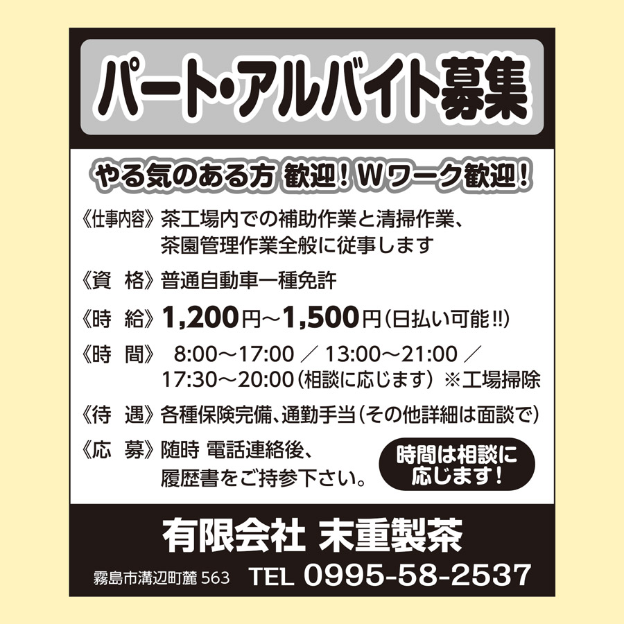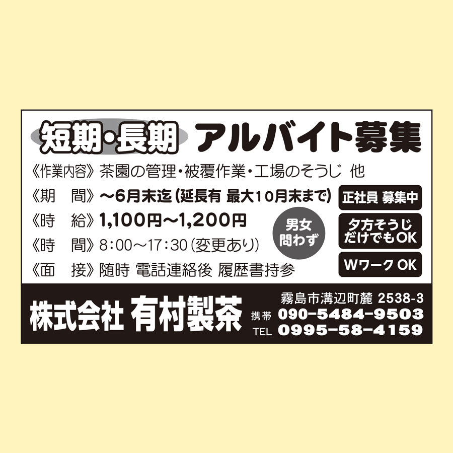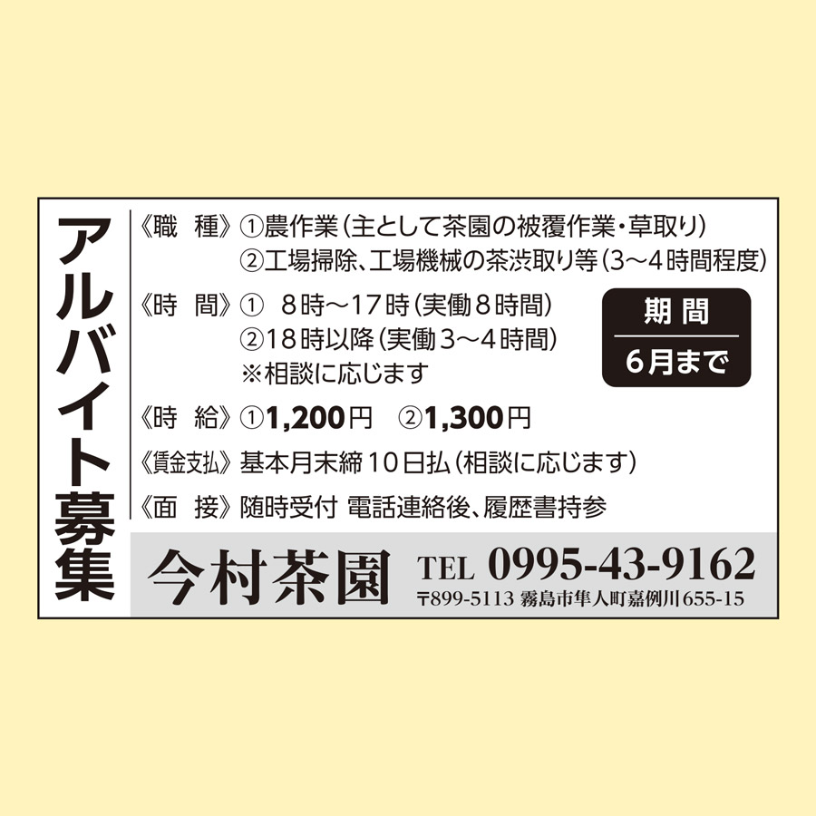 職種: 茶工場内での補助作業と清掃作業、茶園管理作業全般に従事します