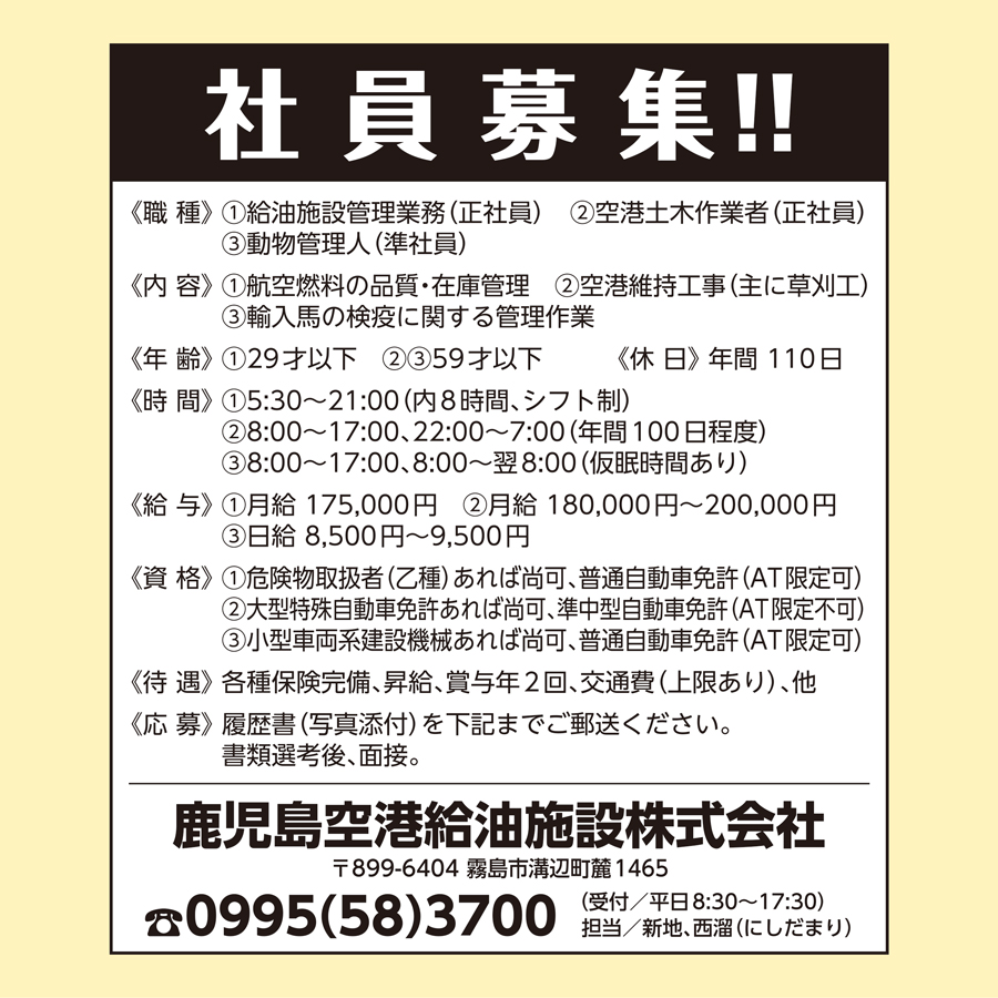 職種: ①給油施設管理業務 ②空港土木作業者 他
