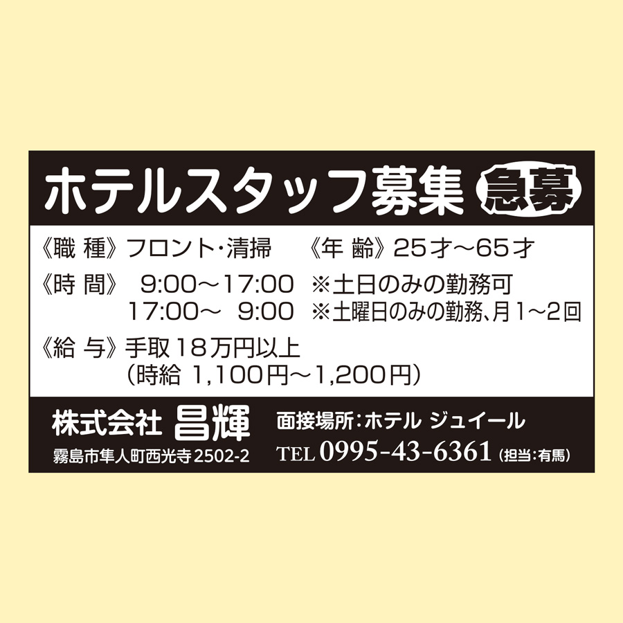 時間: 9:00〜17:00 ※土日のみの勤務可/17:00〜9:00 ※土曜日のみの勤務、月1〜2回