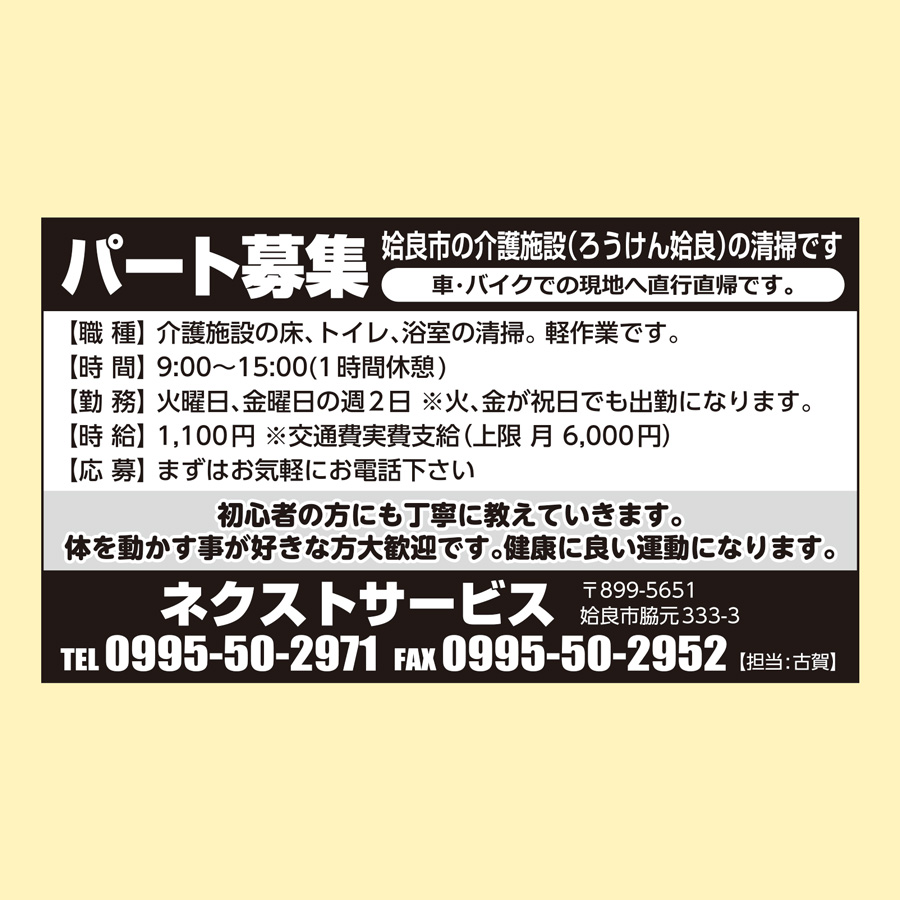 職種: 介護施設の床、トイレ、浴室の清掃。軽作業です。