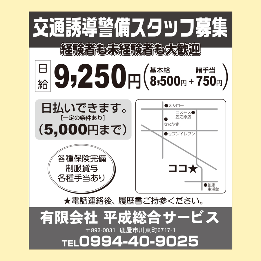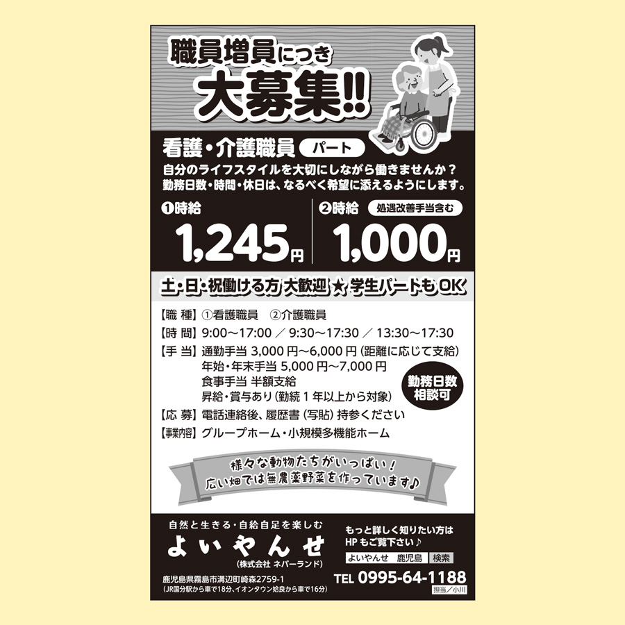 給与: 日給(資格者)9,250円 基本給 8,500円+諸手当 750円
