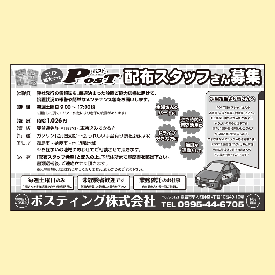 時間: 毎週土曜日 9:00~17:00頃 (担当して頂くエリア・件数により若干の変動があります)