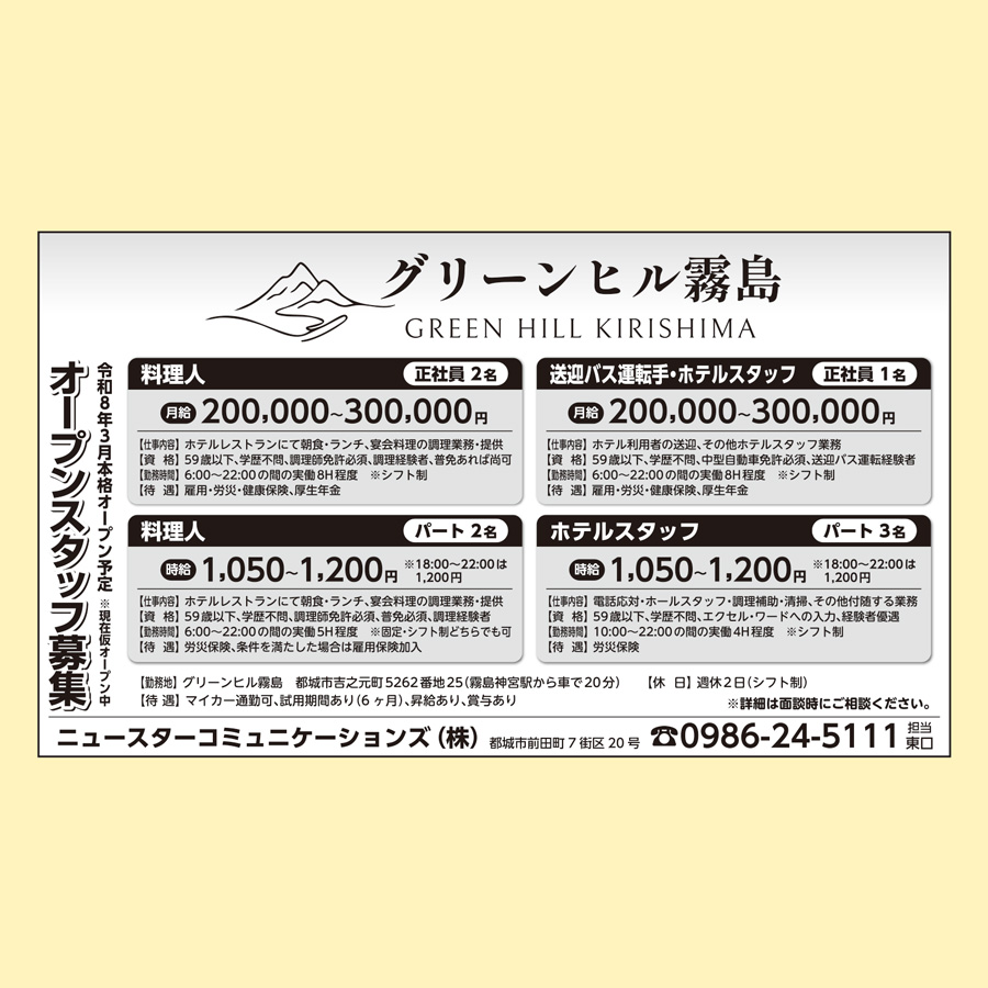 住所: 【勤務地】 グリーンヒル霧島 都城市吉之元町5262番地25(霧島神宮駅から車で20分)