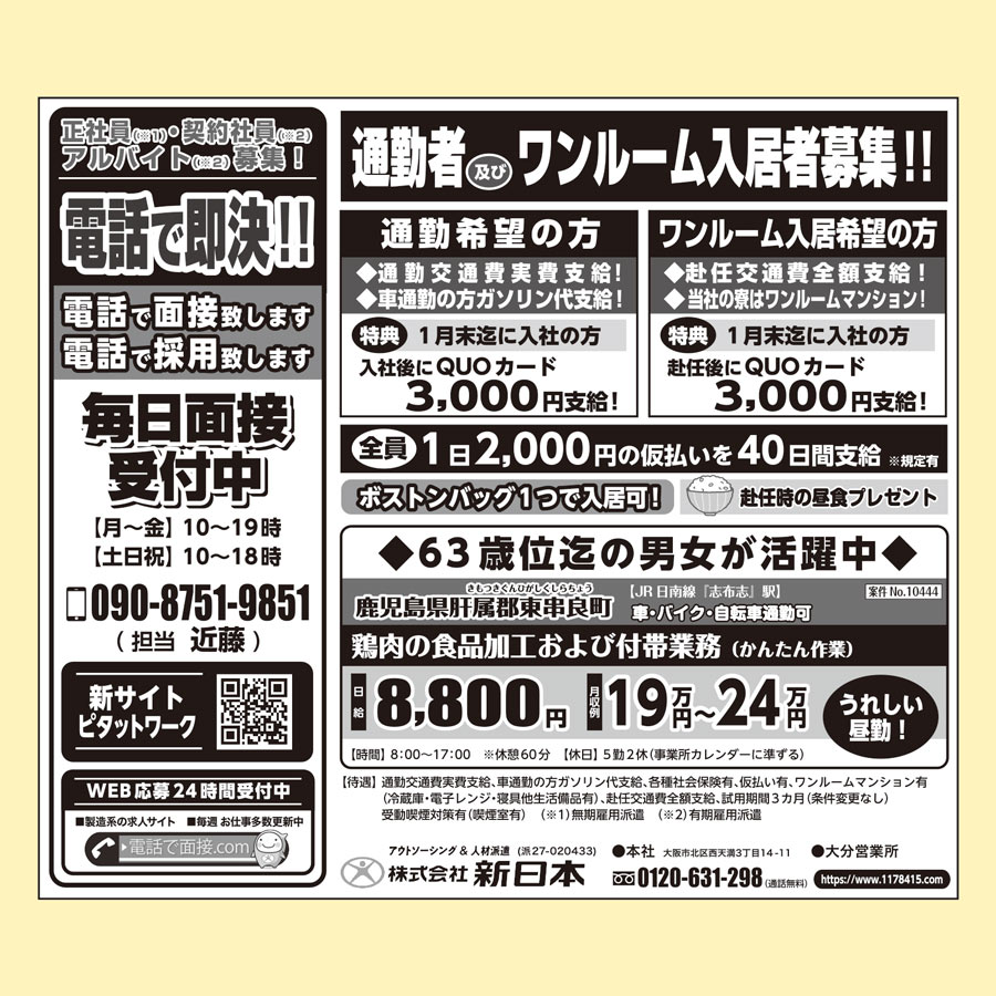 給与: 日給(資格者)9,250円 基本給 8,500円+諸手当 750円
