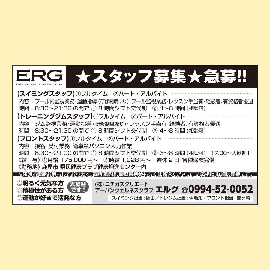 職種: スイミングスタッフ・トレーニングジムスタッフ・フロントスタッフ