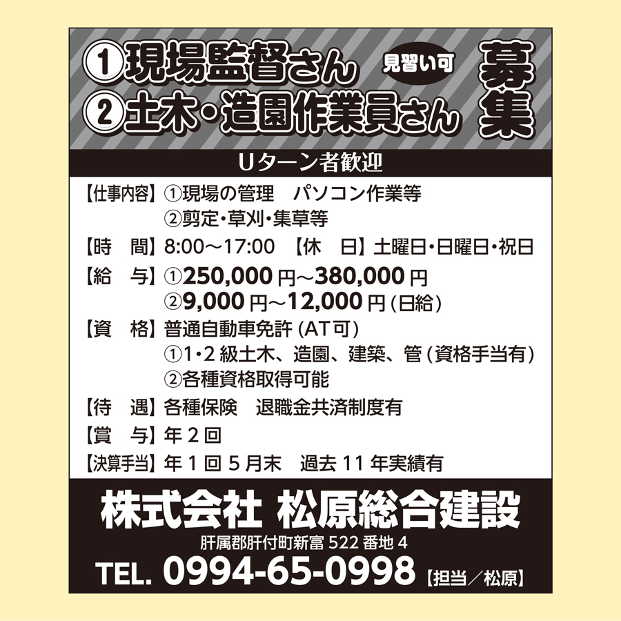 職種: ①現場監督さん 見習い可 ②土木・造園作業員さん