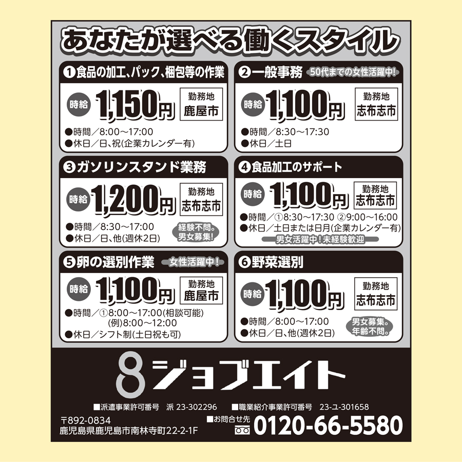 職種: ❶食品の加工、パック、梱包等の作業 他