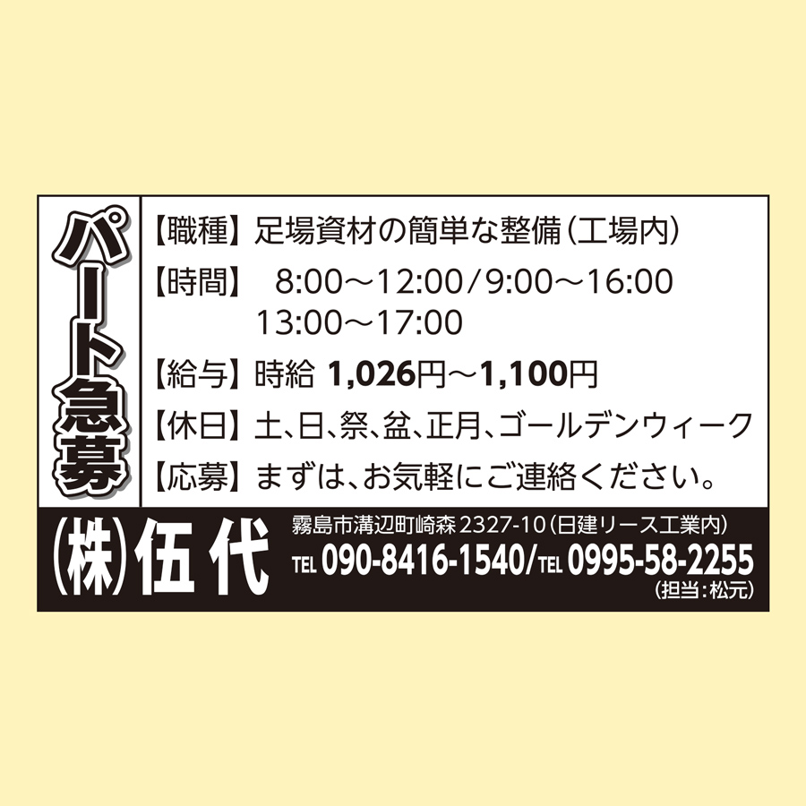 住所: 霧島市溝辺町崎森2327-10(日建リース工業内)